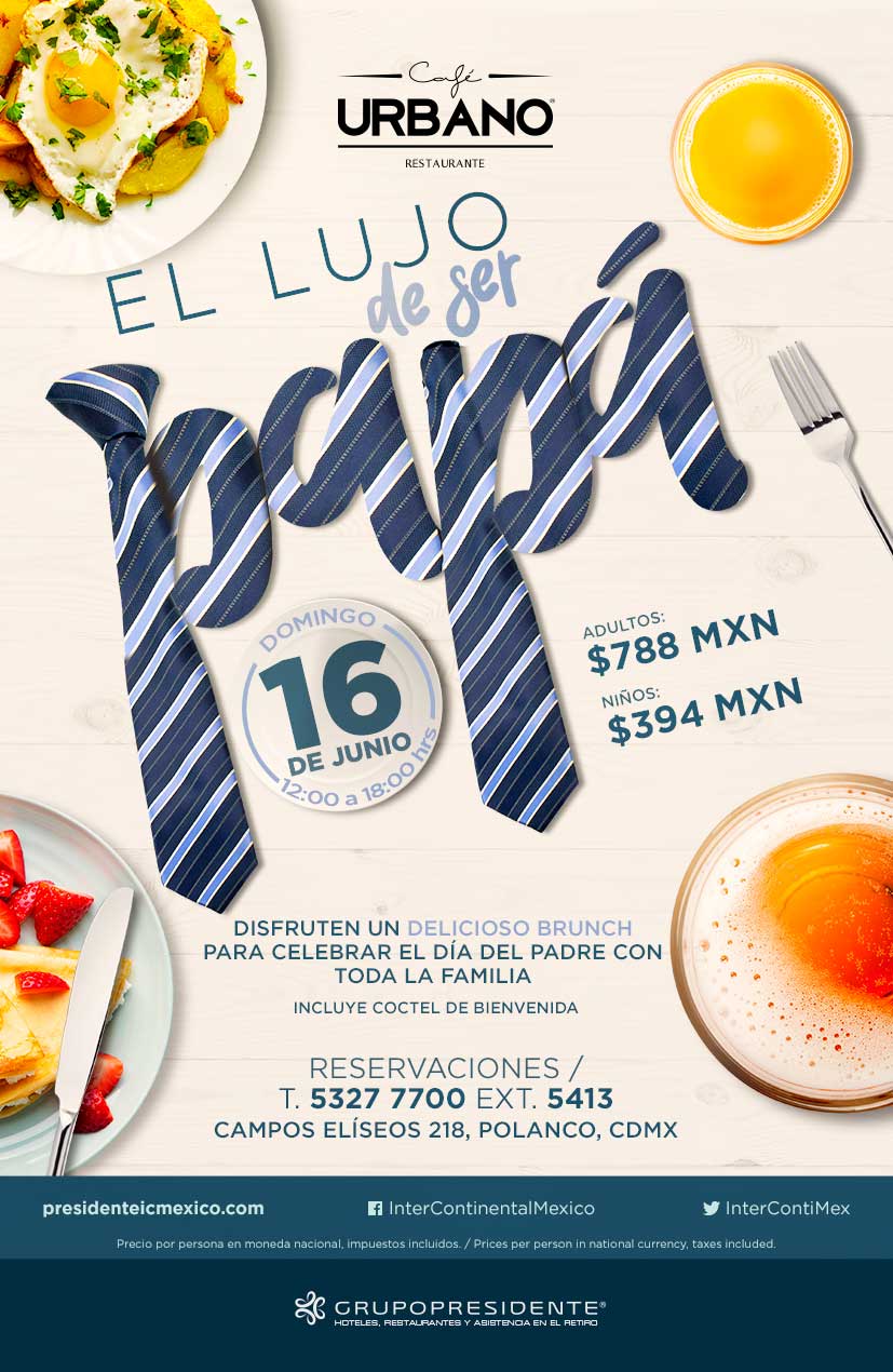 El restaurante Café Urbano ofrecerá un exquisito Brunch con coctel de bienvenida de 12 a 18 horas. Entre las delicias a degustar se encuentran estaciones de ensaladas, fuentes de mariscos, ceviches y cocteles, carnes frías, quesos y chutneys, carving station, rincón temático francés, antojitos mexicanos y zona BBQ, además de una gran variedad de postres.