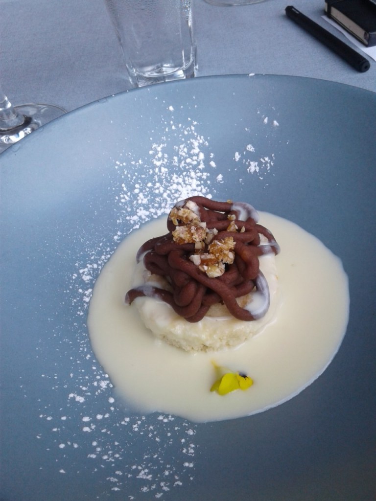 Para finalizar un Sorbete de Capirotada Montblanc de camote y cacao: cerrando con un Petit Four compuesto por naranja fingida, trufa de mamey y almendra, y un bombón de chocolate relleno de mezcal y jamaica.