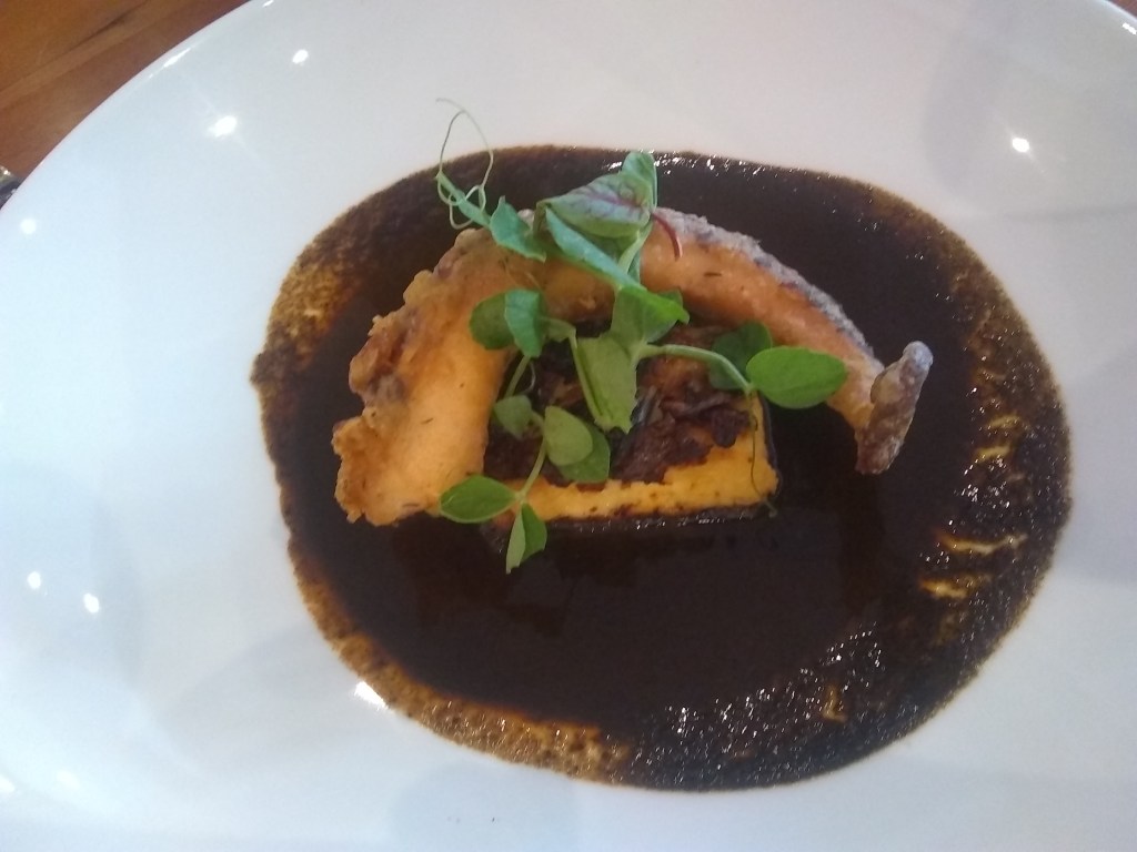 En segundo lugar se sirve un Trío de Flautas Chilangas: lengua, suadero y campechana, que se acompañó con un vino XA tinto; continúa con el tercer tiempo compuesto por Pulpo al Tempura de Maíz sobre quiché de cluitlacohe (o huitlacoche) sobre recado negro de chiles tatemados que reultó verdaderamente espectacular, con vino Chateau blanco.