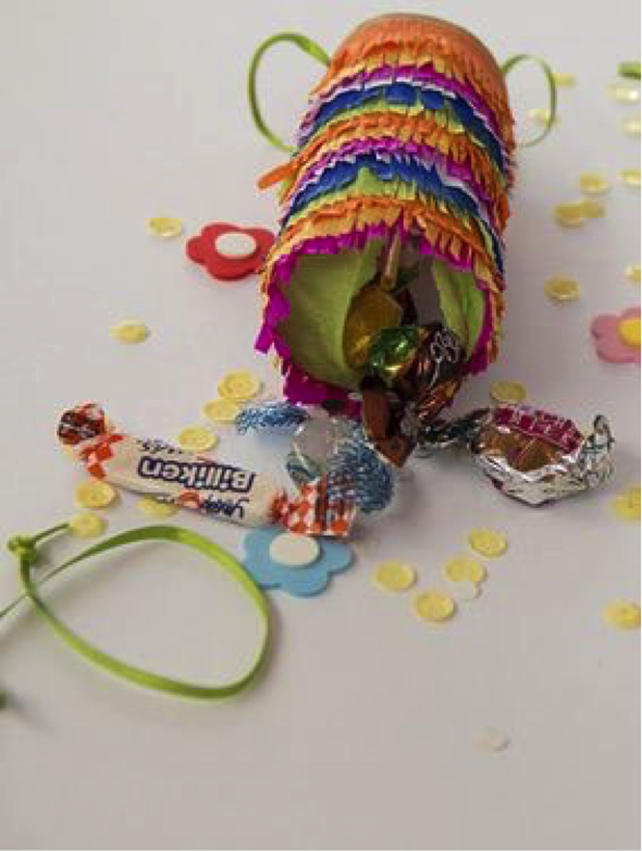 Pega el listón con un poco de cinta en el centro del orificio que fue cubierto con papel china. • Haz dos orificios a los lados del rollo de cartón para colocar otro listón y así sostener la piñata.