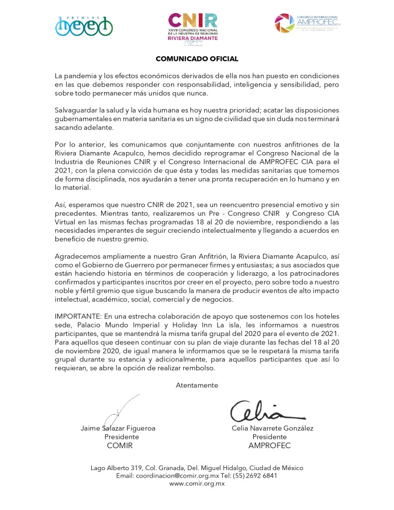 El Consejo Mexicano de la Industria de Reuniones (COMIR) y la Asociación Mexicano de Profesionales de Ferias, Exposiciones y Convenciones (AMPROFEC) acordaron conjuntamente con los anfitriones de Riviera Diamante Acapulco, reprogramar el Congreso Nacional de la Industria de Reuniones CNIR y el Congreso Internacional de AMPROFEC CIA que se llevaría a cabo del 18 al 20 de noviembre de 2020 en Riviera Diamante Acapulco para el año 2021, con la plena convicción de que ésta y todas las medidas sanitarias que se tomen de forma disciplinada, ayudarán a tener una pronta recuperación en lo humano y en lo material.