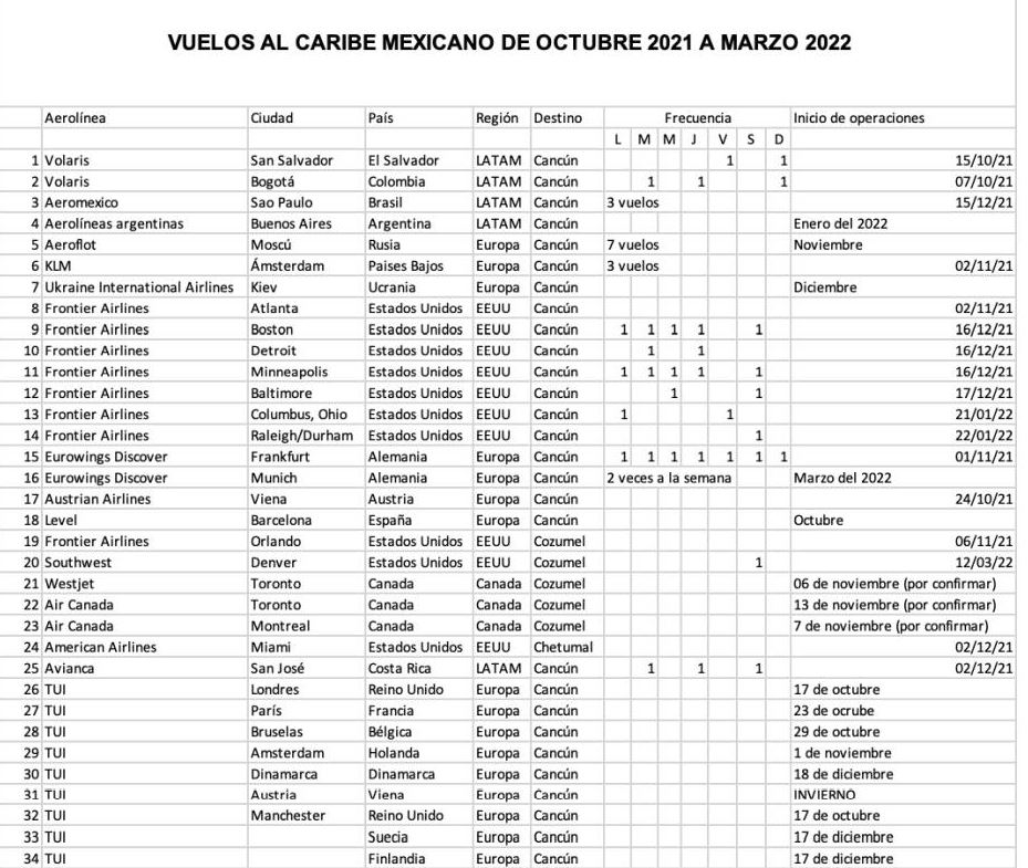 aerolíneas llegan al Caribe Mexicano como Austrian Airlines desde Viena el próximo 24 de octubre y desde Ámsterdam llega por primera vez la aerolínea KLM el 2 de noviembre, así como desde otros destinos de Estados Unidos de América, como el vuelo de Miami a Chetumal el