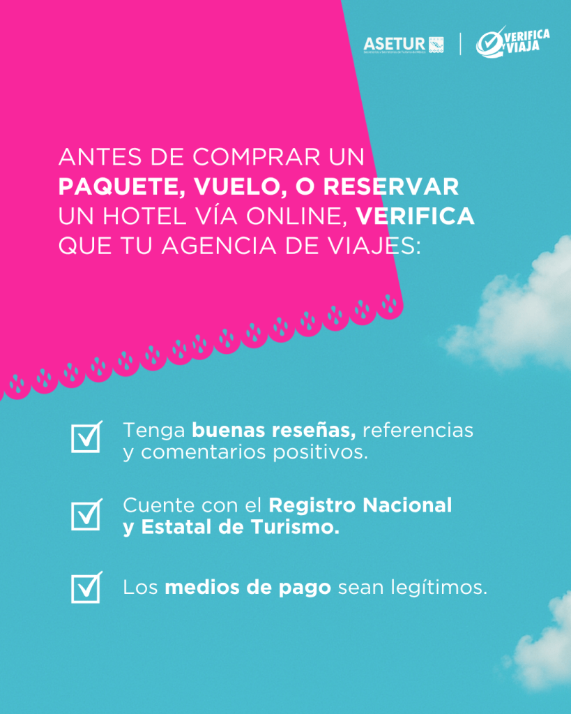 Frente a esta problemática que va en aumento, la Unión de Secretarias y Secretarios de Turismo de México ASETUR, presidida por Bernardo Cueto Riestra, decidió reactivar la campaña “Verifica y Viaja”, en coordinación con la Secretaría de Turismo federal. Esta iniciativa, impulsada desde la Comisión de Protección al Turista de ASETUR —liderada por el estado de Colima—, busca convertirse en una herramienta práctica, accesible y nacional para fortalecer la confianza del viajero y blindar la experiencia turística desde su primer paso: la compra.